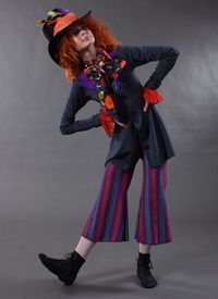 Body im Jackenstil mit Schleife und Manschetten, weite Schlaghose, Hut mit Perücke.