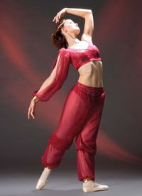 Professionelles Kostüm in Puppenoptik. Oberschenkellanger Tüllrock, obere Lage aus Crêpe. Glitzernde Ärmel mit Satinband verziert.
